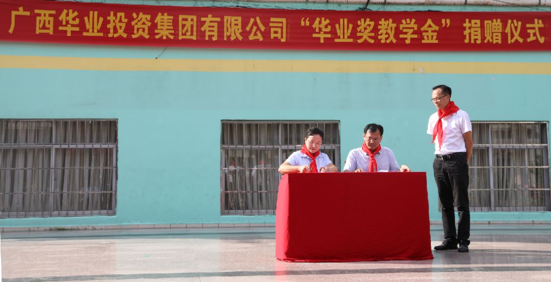 在防城區(qū)紅十字會許紹藝主任的見證下,華業(yè)集團副總裁廖人興與防城區(qū)第二小學(xué)校長雷美蓮代表雙方簽署金額為人民幣三十五萬元的“華業(yè)獎教學(xué)金”捐贈協(xié)議。