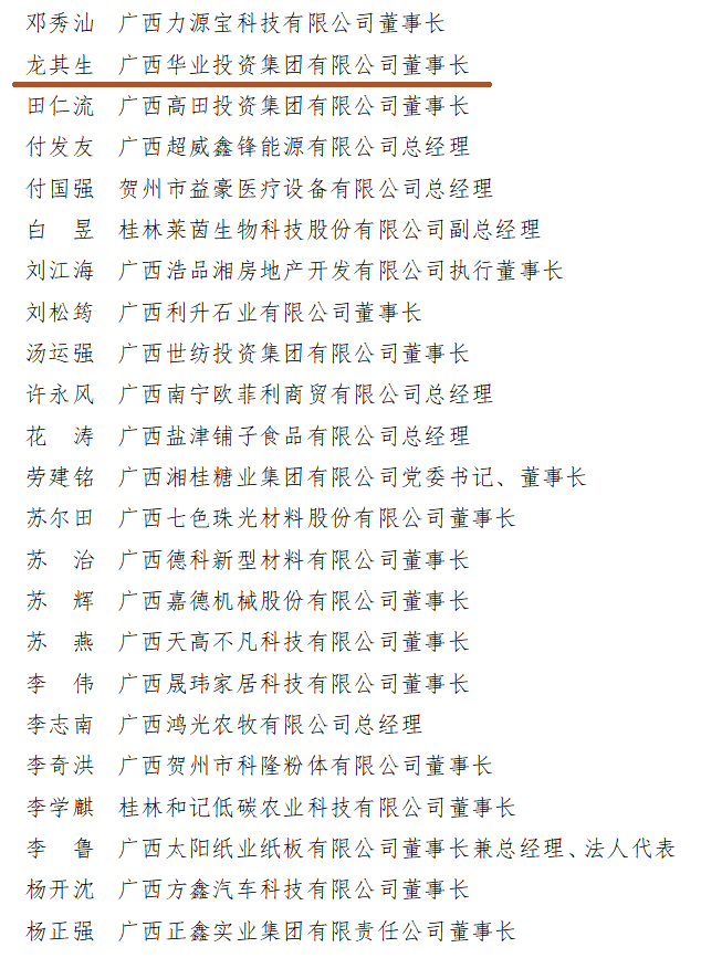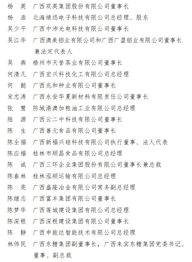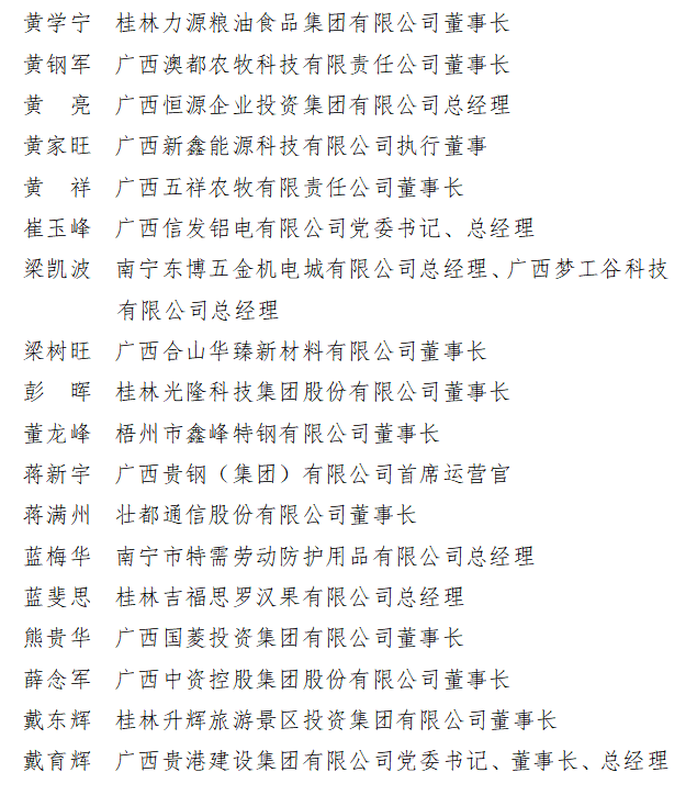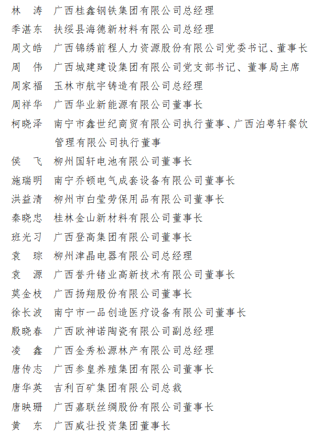 為進(jìn)一步激勵廣大民營企業(yè)家堅定理想信念,不斷激發(fā)創(chuàng)業(yè)創(chuàng)新熱情,履行社會責(zé)任,助力鄉(xiāng)村振興,11月22日,自治區(qū)黨委統(tǒng)戰(zhàn)部、自治區(qū)工商聯(lián),廣西光彩事業(yè)促進(jìn)會決定對黃東等2022年度98位優(yōu)秀民營企業(yè)家進(jìn)行通報表揚。